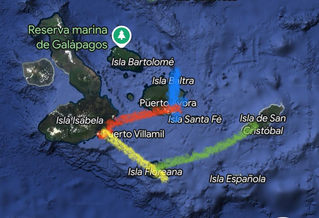 After one night in Puerto Ayora on Santa Cruz, we will board the boat and run to the giant blue marlin grounds off Isabela (red line). After a few days fishing off Isabela and nights on the island, we will fish to Floreana (yellow line), and spend two nights there and fish off Floreana, again for giant blues.