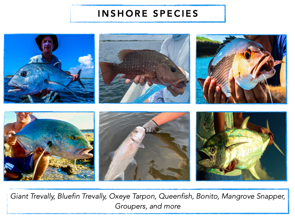 We target larger GTs, and load of other trevally species too. Casting large flies and poppers to along the rock and reef edges and into baitbaills is our tactic – we aren’t scared of teasing with spinning rods with large poppers and stick baits either.